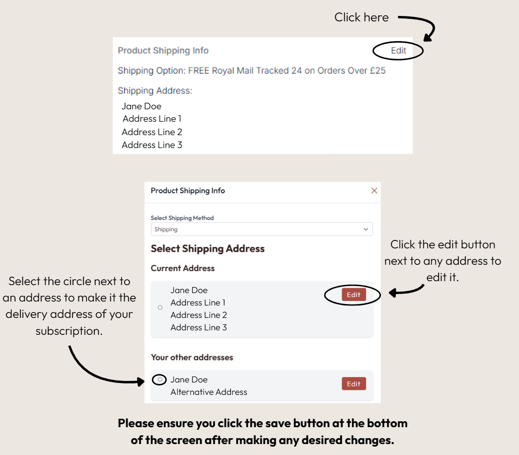 If the location you wish to have your subscription items delivered to has changed, you can easily edit the delivery address of your subscription by signing in on our website and then selecting the 'My Subscriptions' page. From here you can select the edit button in the 'Product Shipping Info' section and make your desired changes, as shown below.
