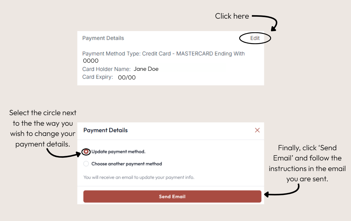 You can change your payment details by signing in on our website and then selecting the 'My Subscritpions' page. From there you can select the edit button in the 'Payment Details' section and choose how you wish to change your payment details as shown below.