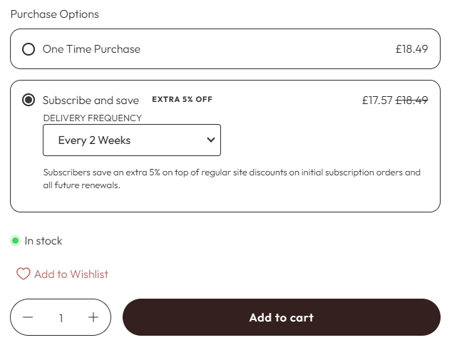 To create a subscription simply select the subscribe and save purchase option when adding a product you wish to create a subscription for to your cart. Make sure to select the delivery frequency that is suited to your needs before clicking add to cart.