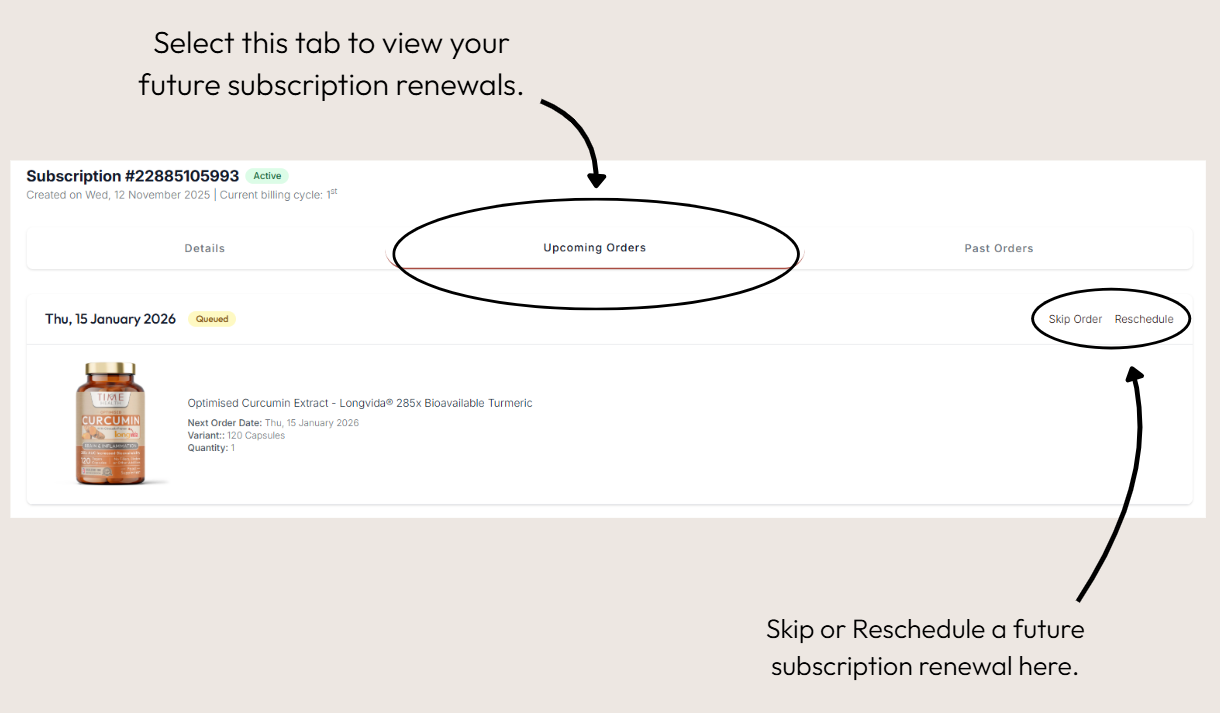 Firstly, sign in on our website and then simply select the My Subscription button to view all of your subscriptions. Once on this page you can select the 'Upcoming Orders' tab to view, skip and reschedule your future subscription renewals.